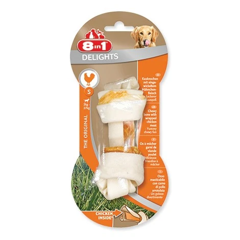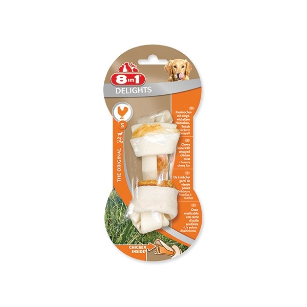 8in1 Delights je lahodná žuvacia kosť pre dospelých psov. Kosť je vyrobená zo sušenej kože a je plnená sušeným kuracím mäsom. Pochúťka má skvelú chuť, pomáha redukovať zubný povlak, predchádza tvorbe zubného kameňa a psíka zabaví na dlhú dobu.