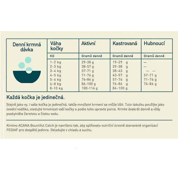 Acana Cat Bountiful Catch je kompletné krmivo pre dospelé mačky všetkých plemien. Granule obsahujú mäso z voľne lovených rýb - lososa, pstruha a sleďa. Túto vynikajúce rybie receptúru si vaša mačka iste zamiluje!