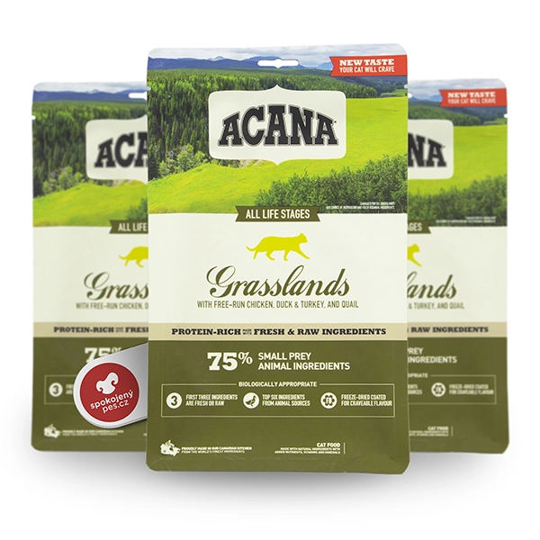 Kompletné krmivo Acana Cat Grain-Free Grasslands pre mačky všetkých vekových kategórií. Krmivo obsahuje mäso z voľne chovaných kurčiat, moriek, kačíc, prepelíc a voľne lovených rýb. Granule sú vyrábané metódou celá korisť. Celá korisť znamená, že je použiťé mäso, orgány, chrupavky a kosti v prirodzenom pomere, aby boli poskytnuté všetky dôležiťé živiny prirodzenou cestou.