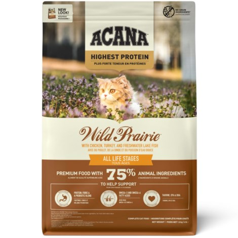 Kompletné krmivo Acana Cat Grain-Free Wild Prairie pre mačky všetkých vekových kategórií. Krmivo obsahuje mäso z voľne chovaných kurčiat, moriek a z voľne lovených rýb. Granule sú vyrábané metódou celá korisť. Celá korisť znamená, že je použité mäso, orgány, chrupavky a kosti v prirodzenom pomere, aby boli poskytnuté všetky dôležité živiny prirodzenou cestou.