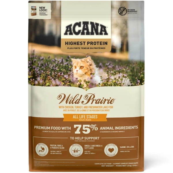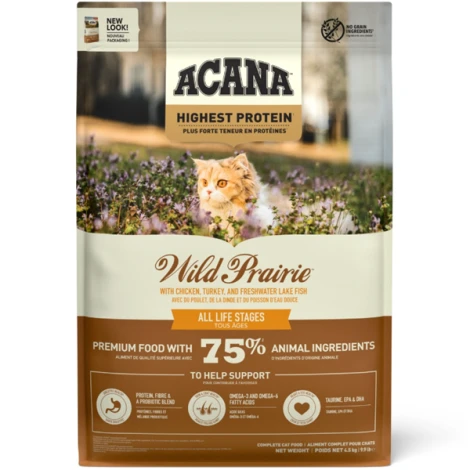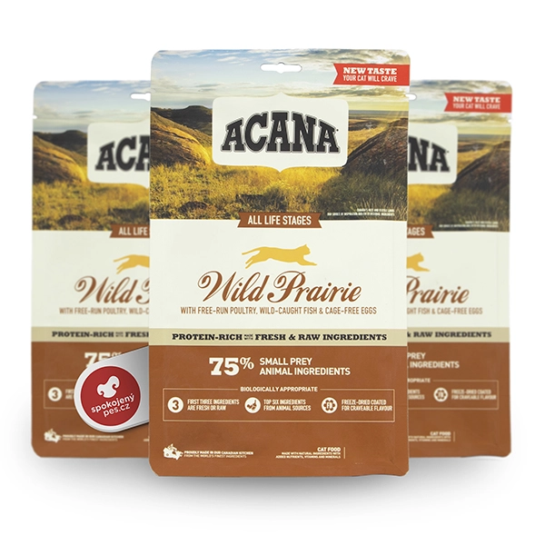Kompletné krmivo Acana Cat Grain-Free Wild Prairie pre mačky všetkých vekových kategórií. Krmivo obsahuje mäso z voľne chovaných kurčiat, moriek a z voľne lovených rýb. Granuly sú vyrábané metódou "celá korisť". Celá korisť znamená, že je použité mäso, orgány, chrupavky a kosti v prirodzenom pomere, aby boli poskytnuté všetky dôležité živiny prirodzenou cestou.