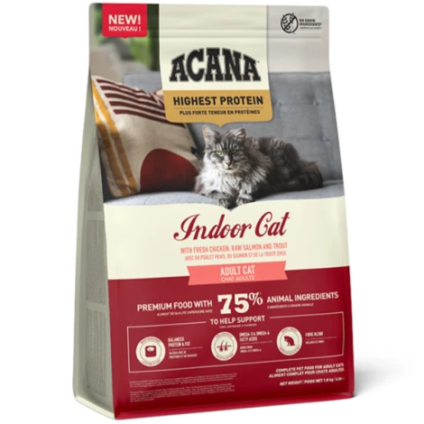 Máte doma mačku, ktorá dbá na kvalitu? Krmivo Acana Highest Protein Indoor Cat pre dospelé mačky žijúce v interiéri prináša poriadnu porciu mäsa z kuracieho mäsa, lososa a pstruha, doplnenú zeleninou, ovocím a bylinkami, ktoré pomáhajú udržiavať zdravú hmotnosť a predchádzajú chlpom v žalúdku.
