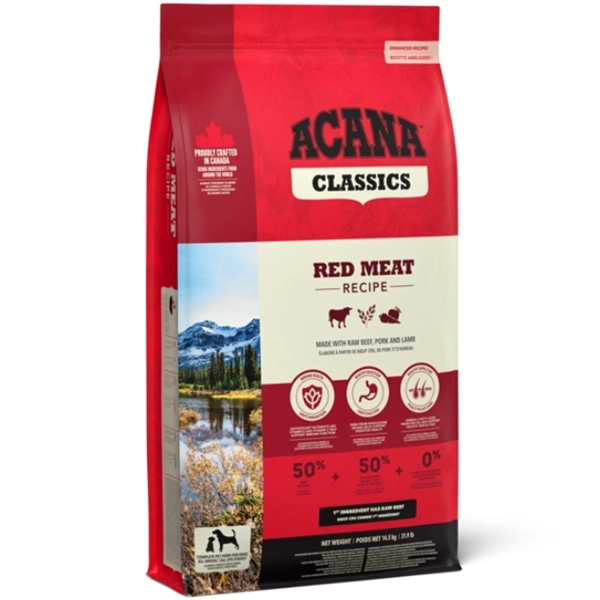 Acana Dog Classics Red Meat s hovädzím, jahňacím a bravčovým mäsom je kompletné krmivo pre psy všetkých vekových kategórií a plemien. Veľmi pestrá a bohatá receptúra zložená z jednoduchých a zdravých zložiek podporí imunitné funkcie, zdravé trávenie a zdravú kožu a srsť.