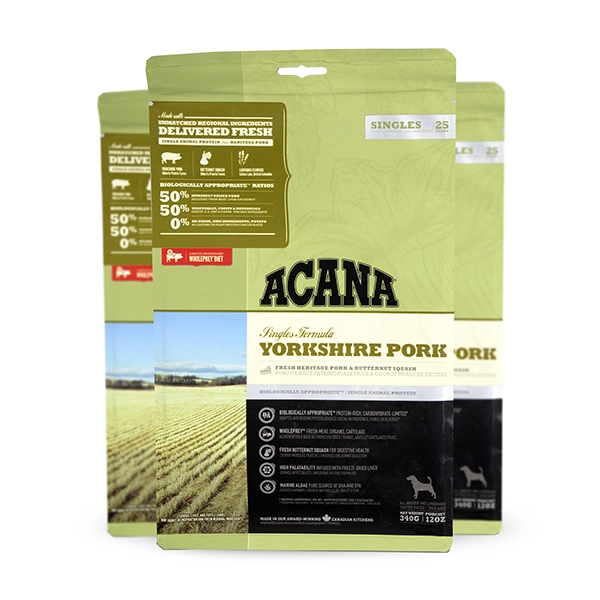 Acana Dog Singles Yorkshire Pork je kompletné krmivo pre psy všetkých plemien i veku. Receptúra s jediným zdrojom živočíšneho proteínu obsahuje 50 % mäsa z yorkshirských ošípaných. Čerstvá tekvica a maslová tekvica prepožičia rozpustnú vlákninu, ktorá je vhodná pre psíkov s citlivým zažívaním. Vďaka výťažku z mrazom sušenej pečene krmivo chutí aj vyberavým jedincom.