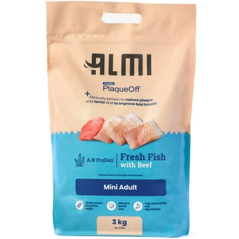Superprémiové krmivo Almi poskytuje komplexnú stravu s ohľadom na potreby dospelých psov malých plemien. Vysoké množstvo čerstvých a kvalitných rýb a hovädzieho mäsa spolu s ryžou, jablkami a brusnicami zabezpečujú absolútne bezchybnú stravu. Ryža zaistí dobrú stráviteľnosť krmiva, podporí trávenie a hodí sa aj pre maznáčikov s citlivým zažívaním alebo alergiou na lepok.