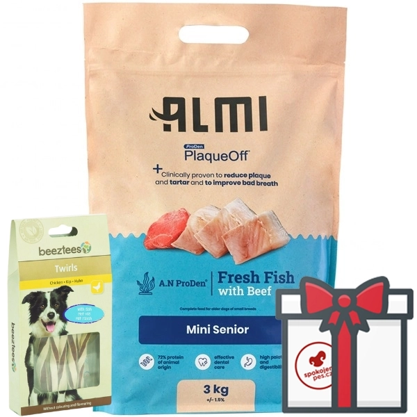 Superprémiové krmivo pre staršie psy malých plemien vyvinuté spoločnosťou Almi s PlaqueOff®, ktorý preukázateľne zlepšuje zdravie zubov, upokojuje a rozpúšťa zubný kameň. Zloženie s čerstvým a vysoko kvalitným sleďom a hovädzím poskytne optimálnu výživu starším psom.
