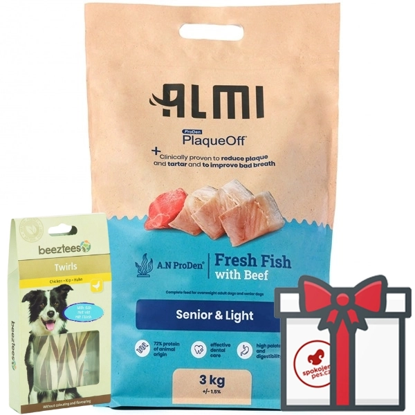 Superprémiové krmivo Almi pre dospelé a staršie psy všetkých plemien s PlaqueOff®, ktorý preukázateľne zlepšuje zdravie zubov a rozpúšťa zubný kameň. Receptúra s čerstvým sleďom a hovädzím mäsom sa stará o trávenie psa, podporuje jeho dobré zdravie a celkovú pohodu.