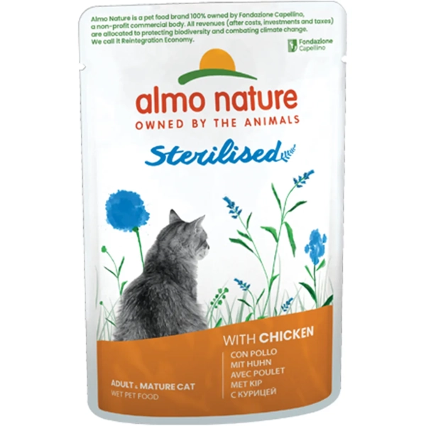 Kompletná kapsička pre kastrované mačky, ktoré majú vyššie tendencie na priberanie a rozvoj ochorenia močového traktu. Almo Nature Cat Functional Sterilised s kuracím mäsom a optimálne vybranými minerálmi pomáha chrániť močové cesty a udržať mačičke ideálne číslo na váhe.