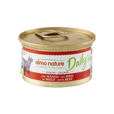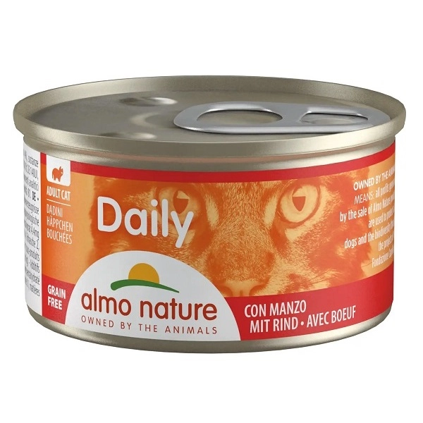 Konzerva pre dospelé mačky Almo Nature Cat Daily s kúskami hovädzieho mäsa v omáčke. Starostlivo vybrané mäso a mäsové produkty dávajú vznik chutnému pokrmu, ktorý s očakávaním uspokojí natešená hladná bruška. Bez obilnín a úplne bez chemických aditív, konzervantov, dochucovadiel a farbív.