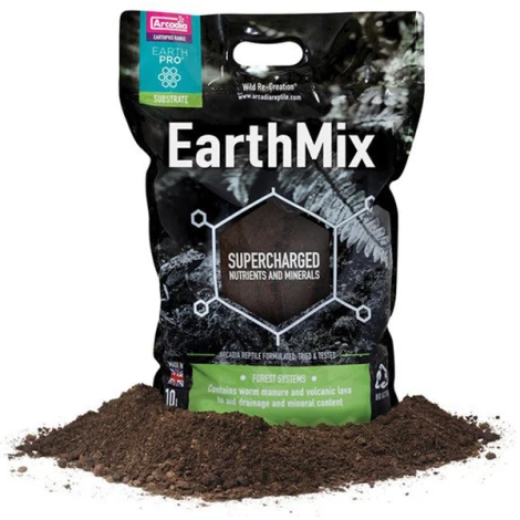 Tento bioaktívny a ekologický substrát obsahuje kompost a vulkanickú lávu, ktorá zlepšuje drenážne vlastnosti (= pomáha odstraňovať prebytočnú vodu) a dodáva minerálne látky. Arcadia Earth Mix je tiež nasýtený základnými prírodnými prvkami. Môže sa používať samostatne alebo ako prímes do substrátov z kôry, piesku, rôznych druhov hliny alebo ílu. Substrát sa môže nechať suchý alebo navlhčený podľa potrieb chovaného druhu.
