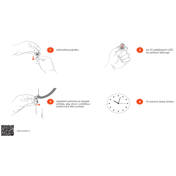 Vyberte prístroj z obalu a odstráňte poistku. Po zablikaní LED svetla sa zariadenie aktivuje. Elektronický repelent upevnite ako prívesok na obojok zvieraťa. Otvor s mriežkou, odkiaľ sú ultrazvukové vlny vydávané, musí smerovať k telu zvieraťa.