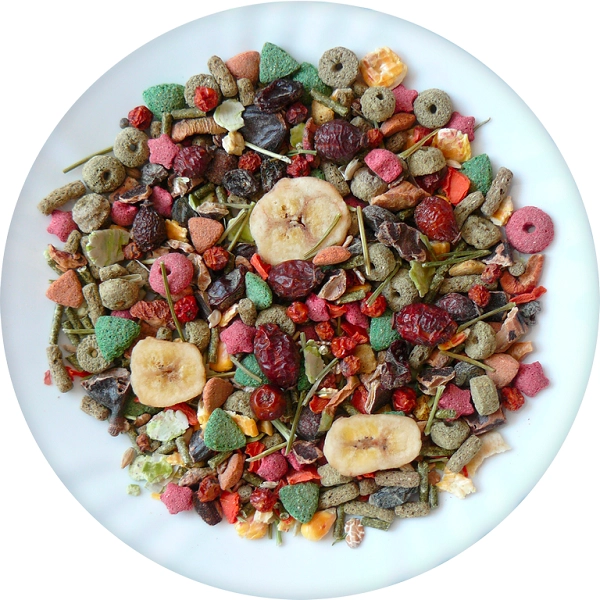 Lucerna, ovocie (šípky, jarabiny, hrozienka, jablká, banány), pšenica, kukurica, hrachové vločky, svätojánsky chlieb, zelenina (petržlen, mrkva), pšeničné vločky, ovos, bylinky.