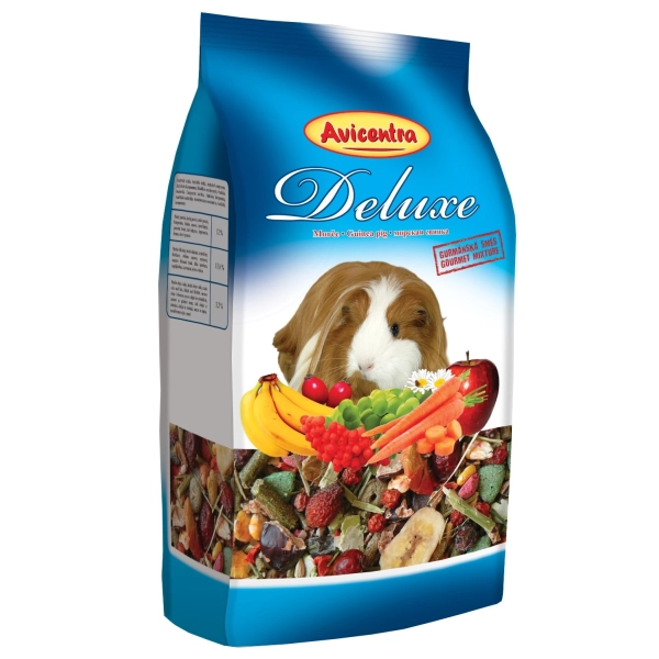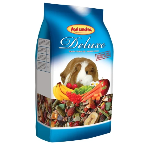 Výberová kŕmna zmes Avicentra Deluxe pre morčatá s množstvom zeleniny a ovocia, bohatá na vitamín C. Superprémiové krmivo najvyššej kvality.