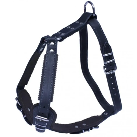 Bafpet Jago je odolný kožený postroj určený pre stredné a veľké plemená psov. Je vyrobený z kvalitnej hovädzej kože, ktorá dobre znáša záťaž a udržiava si svoj tvar. Pre väčšie pohodlie je v oblasti hrudníka a ramien podšitý plsťou, ktorá rozkladá tlak a zabraňuje odieraniu. Vďaka nastaviteľným prackám možno postroj ľahko upraviť, aby dobre sedel. Na pripevnenie vodítka je privarený D-krúžok.