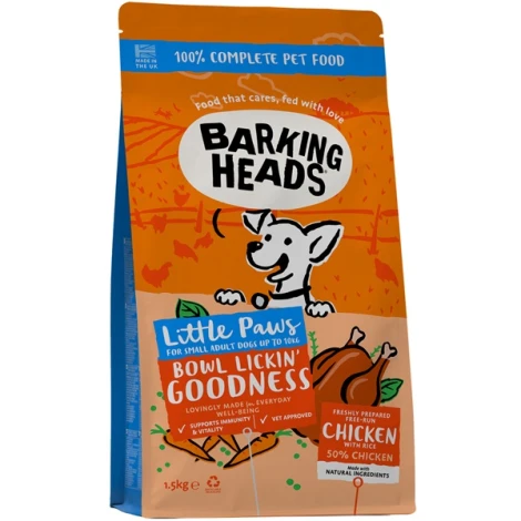 Jedinečné krmivo Barking Heads Little Paws Bowl Lickin' Good Chicken pre malých milovníkov chutného kuracieho mäsa z voľného chovu. Čerstvé mäsové granule vyhovujú všetkým dospelým psom malých plemien a mimoriadne potešia psov s citlivým trávením, riedkou stolicou alebo nadúvaním.