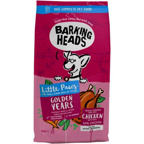Kompletné krmivo Barking Heads Little Paws Golden Years Chicken pre staršie psy malých plemien od 7 rokov. Ľahko stráviteľná receptúra s kuracím mäsom z voľného chovu je doplnená o prírodné antioxidanty, prebiotiká, zvýšenú starostlivosť o kĺby a L-karnitín pre zdravé srdce.