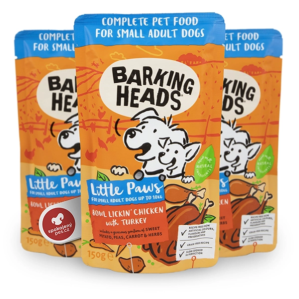 5x kapsičku Barking Heads Little Paws Lickin'Chicken, Turkey 150 g.
