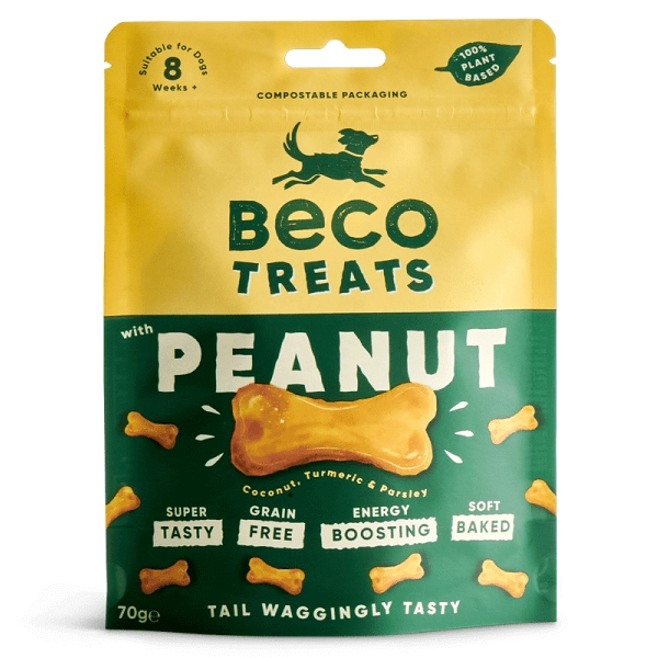 Potešte svojho psa doma pečenými sušienkami s neodolateľnou chuťou plnou bielkovín. Malé kostičky obsahujú len rastlinné suroviny z čo najväčšieho množstva miestnych a obnoviteľných zdrojov, vďaka čomu je ich výroba energeticky efektívnejšia a šetrnejšia k životnému prostrediu. Sušienky Beco Treats obsahujú voňavé arašidové maslo, ktoré je plné zdravých tukov a kvalitných rastlinných bielkovín. Slúžia ako skvelý zdroj energie a zlepšujú koncentráciu. Arašidy sú lahodne doplnené prírodným antioxidantom kurkumou a kokosom, ktoré majú vysoký obsah vitamínov a minerálov vrátane železa pre zdravý rast a vývoj. Balenie má praktickú vreckovú veľkosť a kompostovateľný obal.