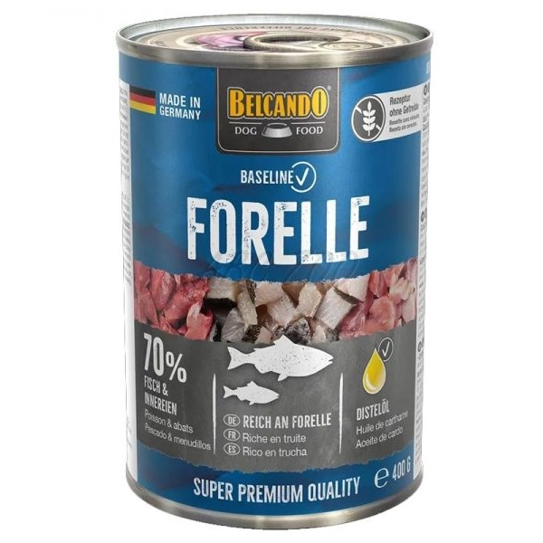 Belcando Baseline Trout je konzerva plná neodolateľnej vône chutného mäsa, je určená pre malé aj veľké psy všetkých vekových kategórií. Receptúra čerstvého pstruha obsahuje 70 % rybieho mäsa a vnútorností, omega-3 mastné kyseliny a cenné vitamíny vrátane vitamínu E zo svetlicového oleja pre zdravú kožu a lesklú srsť. Zložky sú počas výroby jemne varené, aby sa zachovali živiny a chutnosť. Mäso je výlučne potravinárskej kvality.