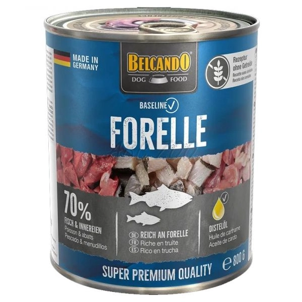 Belcando Baseline Trout je konzerva plná neodolateľnej vône chutného mäsa, je určená pre malé aj veľké psy všetkých vekových kategórií. Receptúra čerstvého pstruha obsahuje 70 % rybieho mäsa a vnútorností, omega-3 mastné kyseliny a cenné vitamíny vrátane vitamínu E zo svetlicového oleja pre zdravú kožu a lesklú srsť. Zložky sú počas výroby jemne varené, aby sa zachovali živiny a chutnosť. Mäso je výlučne potravinárskej kvality.