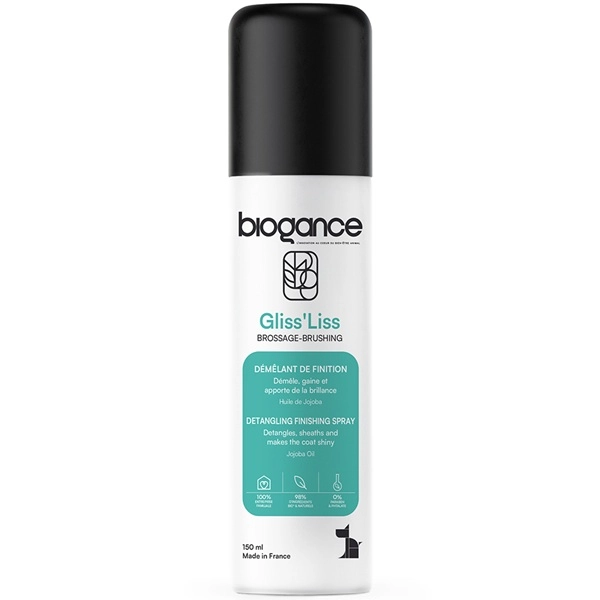 Špičkový rozčesávacia sprej Biogance pre hladkú srsť. Gliss Liss obsahuje cenný jojobový olej, ktorý perfektne zregeneruje srsť, dodá jej žiaduce lesk, uhladí a značne uľahčí rozčesanie zamotaných chumáčikov.
