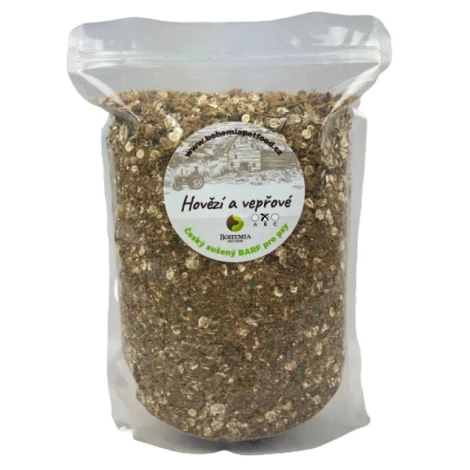 Nalejte horúcu vodu 0,5 - 1 cm nad hladinu zmesi a nechajte ju niekoľko minút nasiaknuť a vychladnúť. Hoci ide už o kompletné krmivo, môžete pridať ďalšie mäso z konzervy Bohemia alebo iné prísady podľa vlastnej chuti.