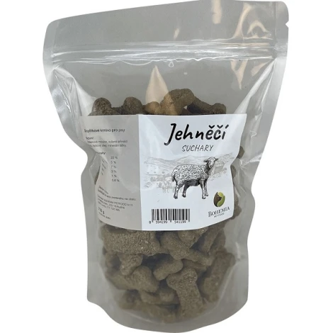 Pečené chrumkavé pochúťky pre psov Bohemia s jahňacím mäsom potešia každého psa. Chrumkanie sušienok v tvare kostičky posilňuje žuvacie svaly a pomáha čistiť zuby. Jahňacie mäso s grahamovou múkou dokonale dopĺňa tymián, ktorý dodáva pochúťkam príjemnú vôňu.