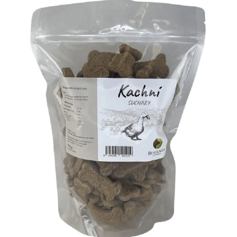 Chrumkavé pochúťky s kačacím mäsom v tvare lákavých kostičiek dokonale spestria stravu vášho štvornohého člena svorky. Psie sušienky od českej značky Bohemia dodržiavajú šetrné spracovanie, regionálne suroviny a čisto prírodné zloženie. Chrumkanie psích sušienok pomôže posilniť žuvacie svaly, vyčistiť zuby a zabrániť tvorbe zubného kameňa. Kačacie mäso s grahamovou múkou príjemne dopĺňa voňavý tymián.