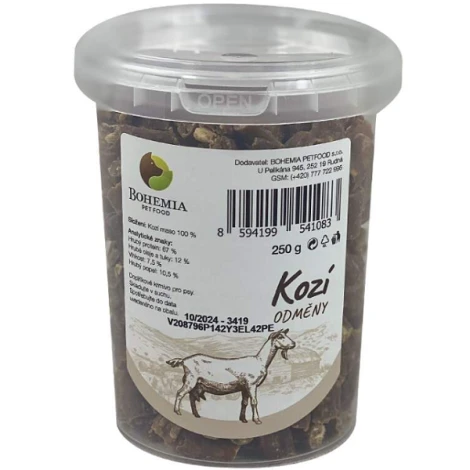 Pochúťky zo 100 % kozieho mäsa od českej spoločnosti Bohemia sú ideálne na každý tréning. Sú malé, ľahko žuvateľné a dodávajú sa v praktickom uzatvárateľnom vedierku. Tréningové pochúťky sa môžu pochváliť čisto prírodným zložením bez chemických látok.