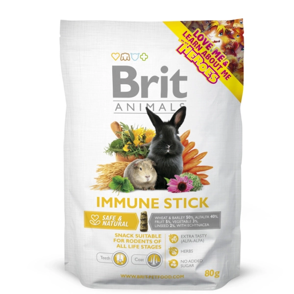 Brit Animals Immune Stick je prírodná maškrta pre hlodavce a králiky. Zloženie neobsahuje pridaný cukor a má znížený obsah kalórií. Jedná sa o produkt českej výroby, ktorý malým zvieratkám spestrí dennú stravu.