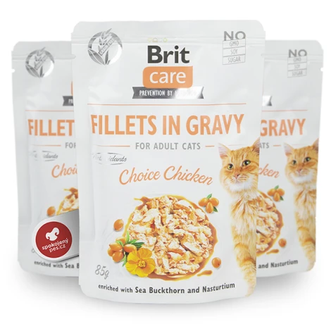Chutné krmivo pre mačky Brit Care Fillets Gravy vo forme kapsičiek s lahodnými kúskami mäsa vo filety. Obsahujú vysoký podiel mäsa a kombináciu bylín na podporu zdravého močového aparátu mačiek. Neobsahujú obilniny, pridaný cukor, sóju ani GMO. Receptúra s kuracím mäsom je vhodná pre všetky dospelé mačky.
