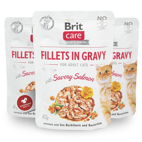 Chutné krmivo pre mačky Brit Care Fillets Gravy vo forme kapsičiek s lahodnými kúskami mäsa vo filety. Obsahujú vysoký podiel mäsa a kombináciu bylín na podporu zdravého močového aparátu mačiek. Neobsahujú obilniny, pridaný cukor, sóju ani GMO. Receptúra s lososom je vhodná pre všetky dospelé mačky.