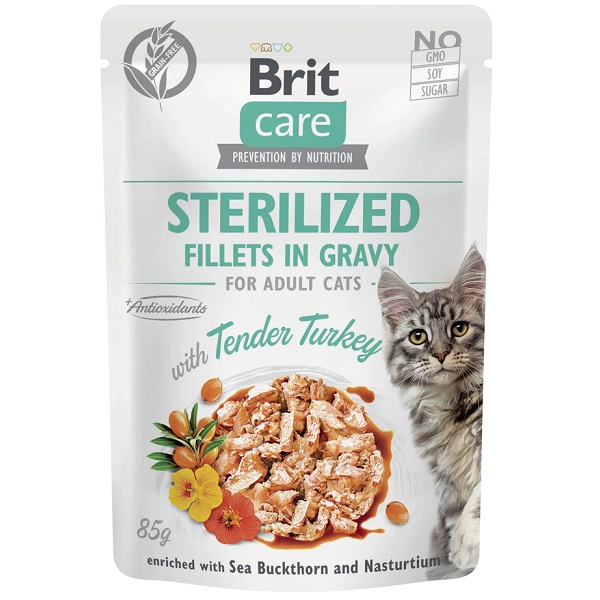 Chutné krmivo s jemným morčacím mäsom pre kastrované mačky Brit Care s lahodnými kúskami mäsa vo forme filiet. Kapsičky obsahujú vysoký podiel mäsa a kombináciu kapucínky a rakytníka pre zdravie močových ciest mačiek. Bez obilnín a ideálne pre veľmi vyberavé mačky.