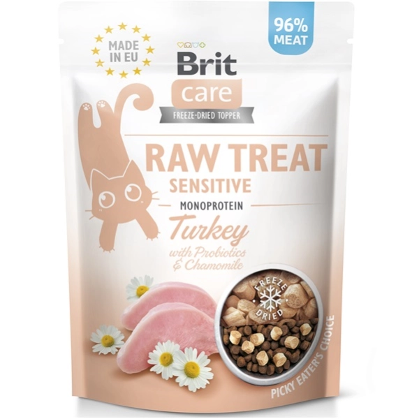 Výnimočná čerstvosť, neodolateľná chuť a maximálne zachovanie živín. Brit Care Cat Raw Treat Sensitive Turkey lyofilizované monobielkovinové pochúťky z čerstvého morčacieho mäsa obohatené o probiotiká a harmanček potešia všetky dospelé mačky, najmä tie s citlivým trávením.