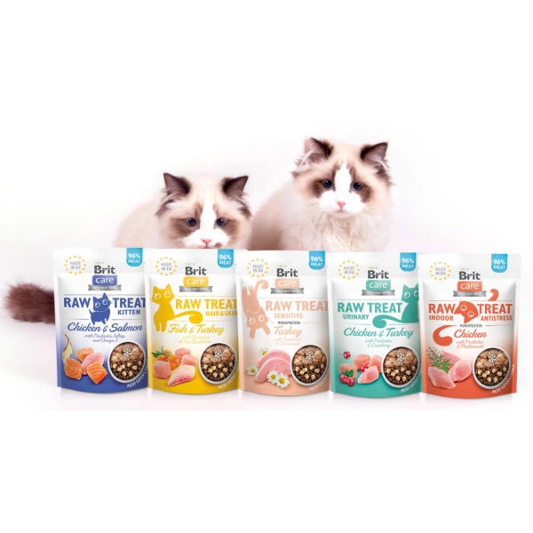 Výnimočná čerstvosť, neodolateľná chuť a maximálne zachovanie živín. Brit Care Cat Raw Treat Indoor & Antistress Chicken lyofilizované monobielkovinové pochúťky z čerstvého kuracieho mäsa, obohatené o probiotiká a srdcovník, potešia všetky dospelé mačky, najmä tie so sklonom k alergiám.