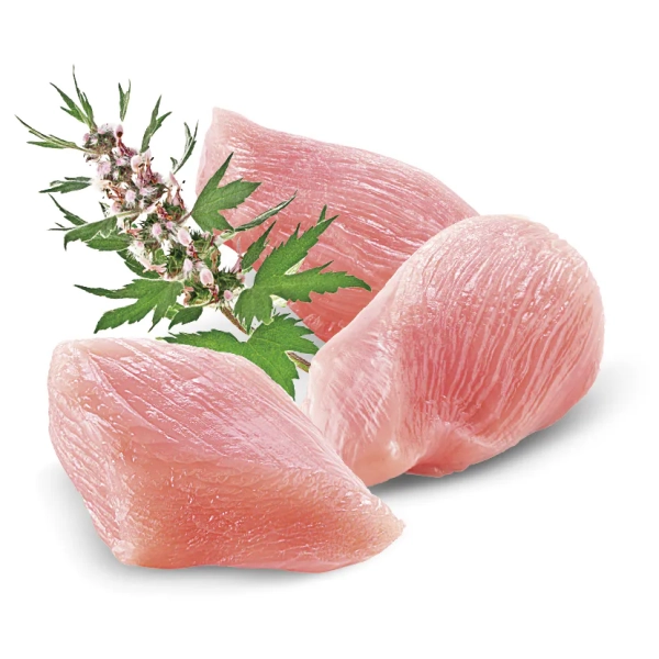 Čerstvé kuracie odrezky (96 %), lignocelulóza (2 %), sušený srdcovník (0,5 %), hydrolyzované kvasnice (0,5 %, zdroj inozitolu a aminokyselín), inaktivované baktérie a ich časti (Lactobacillus helveticus HA - 122, 15x109 buniek/kg).