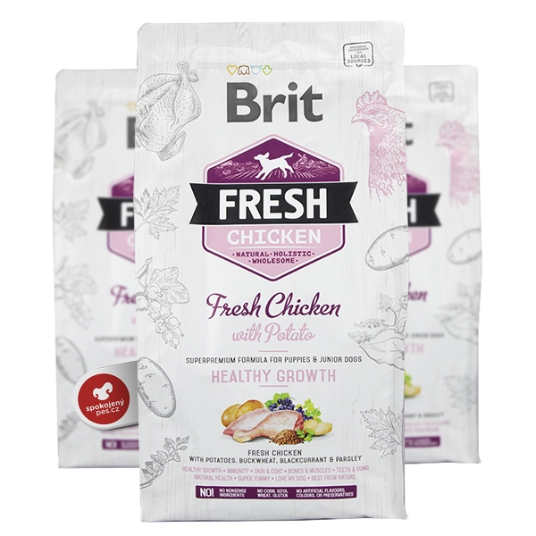 Holistické krmivo pre milovníkov čerstvého mäsa a prírodných surovín . Brit Fresh Chicken & Potato Puppy Healthy Growth je určené šteňatám a rastúcim psom . Receptúra sa zakladá na čerstvom aj sušenom kuracom mäse , zemiakoch, pohánke, jablkách a čiernom ríbezlí.