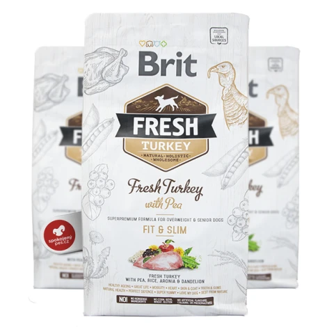 Holistické krmivo pre milovníkov čerstvého mäsa a prírodných surovín. Brit Fresh Turkey & Pea Adult Fit & Slim je krmivo s čerstvým mäsom pre psov, ktorí potrebujú znížiť telesnú hmotnosť alebo je u nich nutné predísť riziku vzniku nadváhy. Skvelá chuť aj výživa bez obmedzenia.
