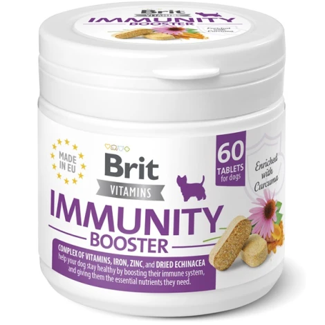 Brit Vitamins Immunity Booster pomáha posilňovať prirodzenú imunitu. Chutné tablety obsahujú dvadsať prírodných zložiek so základnými vitamínmi a minerálmi na podporu imunitného systému v období zvýšeného stresu, choroby a staroby.