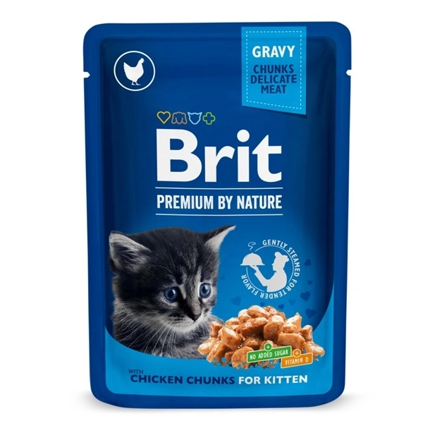 Brit Premium Cat kapsička Chicken Chunks for Kitten 100 g je kompletné prémiové krmivo pre mačiatka v praktickom balení. Obsahuje mäkké mäsové kúsky v šťave, ktorá je jemná a chuťovo výrazná. Výber chutí rešpektuje prirodzené preferencie mačiek aj ich nutričné potreby z hľadiska fázy veku či špeciálnej výživy. Delikátna šťava podčiarkuje chuť mäsových kúskov a dodá mačke potrebné tekutiny. Mačky ju milujú! Kapsičky sú pripravované unikátnou šetrnou metódou varenia v pare pre zachovanie originálnej chuti a jedinečnej vône mäsa. Bez konzervantov a farbív.