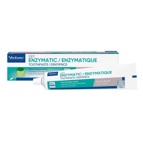 C.E.T. enzymatická zubná pasta od spoločnosti Virbac je s hydinovou príchuťou. Pasta obsahuje enzymatický systém, ktorý aktivuje a posilňuje prirodzené obranné mechanizmy v ústnej dutine. Pomocou nej dochádza k odstraňovaniu zubného plaku a zníženiu zápachu z papule.