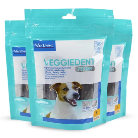 C.E.T. Veggiedent Frest od spoločnosti Vibrac majú inovatívny tvar, ktorý umožňuje lepšie uchopenie maškrty a jej žuvanie. Žuvacie plátky kombinujú mechanický čistiaci účinok s aktívnymi zložkami a tým zamedzujú vzniku zubného kameňa. Práve zubný kameň trápi psíky a jeho neriešenie môže viesť až k problémom s ďasnami. Na ústnu hygienu malých psov s hmotnosťou do 10 kg. Balenie obsahuje 15 ks plátkov. Podávajte psovi 1 plátok denne alebo podľa pokynov veterinára. Vždy by mala byť k dispozícií pitná voda.
