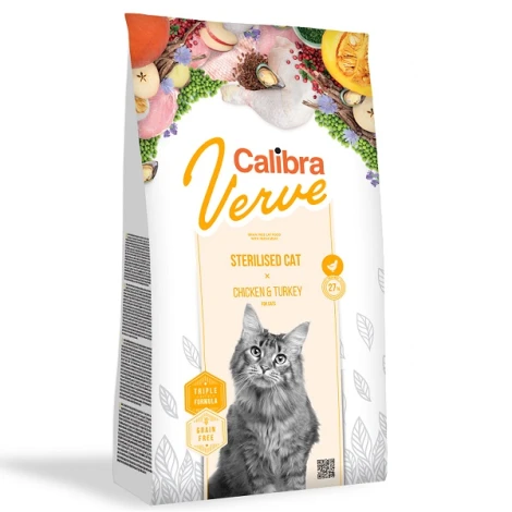 Calibra Cat Verve GF Sterilised Chicken & Turkey je kompletné krmivo pre kastrované mačky s čerstvým mäsom. Receptúra je bez obilnín a obsahuje čerstvé kuracie a morčacie mäso - 27%.