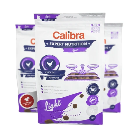 Calibra Dog Expert Nutrition Light je krmivo so zníženou energetickou hodnotou, prispôsobené požiadavkám na zníženie hmotnosti alebo udržanie optimálnej telesnej hmotnosti u psov so sklonmi k nadváhe.