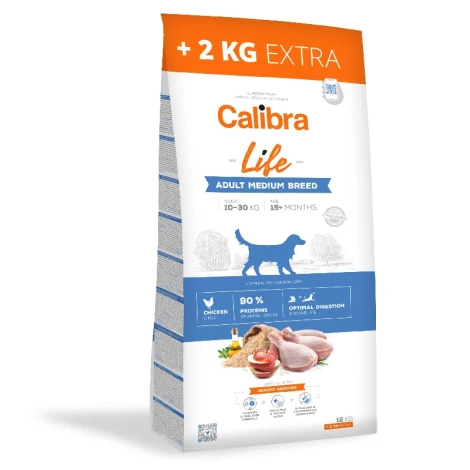 Calibra Dog Life Adult Medium Breed Chicken je superprémiová receptúra vyvinutá špeciálne pre dospelé psy stredných plemien. Zloženie krmiva s obsahom kvalitných kuracích bielkovín dodáva potrebnú energiu pre aktívny štýl života a pre optimálny stav tráviaceho ústrojenstva. Výhodne balenie 12+2 kg!