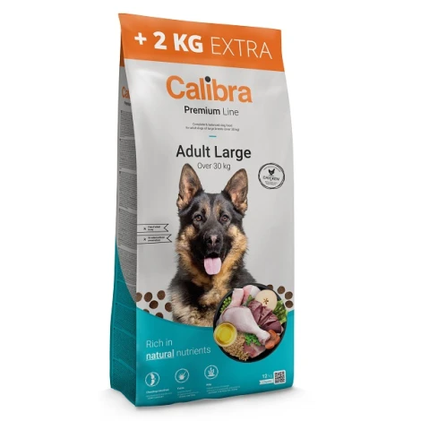 Kompletné krmivo Calibra Dog Premium Line Adult Large s vysokým obsahom kuracieho mäsa pre všetky dospelé psy veľkých plemien nad 30 kg. Receptúra ponúka vyvážený pomer všetkých potrebných živín, minerálov, vitamínov a stopových prvkov pre zdravý a šťastný život psa. Výhodné balenie 12+2 kg!