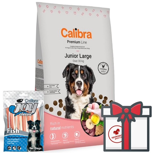 Kompletné krmivo Calibra Dog Premium Line Junior Large s vysokým obsahom kuracieho mäsa pre šteňatá a mladé psy veľkých plemien nad 30 kg. Receptúra ponúka vyvážený pomer všetkých potrebných živín, minerálov, vitamínov a stopových prvkov pre zdravý a spokojný život psíka. Bez pšenice a pšeničného lepku.
