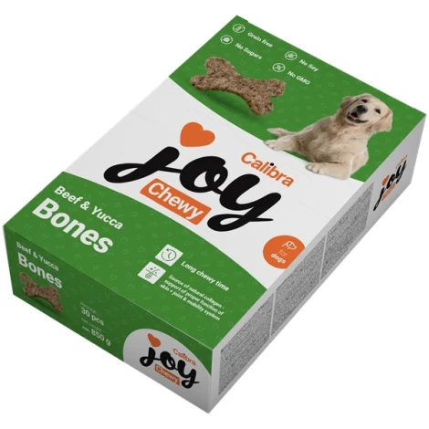 Calibra Joy Dog Chewy Beef & Yucca Bones ponúka obrovskú zásobu žuvacích pochúťok pre psov. Hovädzie žuvacie kosti majú vysoký obsah prírodného kolagénu s Yuccou. Zábavné a výživné. Hovädzí kolagén podporuje správnu funkciu kože, kĺbov a pohybového aparátu, Yucca vďaka svojmu chlorofylu, stopovým prvkom, vitamínom, saponínom a polyfenolom pozitívne pôsobí na tráviaci trakt, znižuje plynatosť a zápach výkalov a vyniká detoxikačnými účinkami.