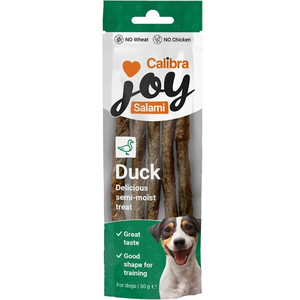 Pre zábavný tréning alebo veselé maškrtenie sú tu salámy Calibra Joy Dog Salami Duck. Lahodná mäsová pochúťka, ktorú možno ľahko rozlomiť na menšie kúsky. Lahodná chuť a kačacia receptúra úplne bez pšenice a kuracieho mäsa. Lahodná pochúťka pre psy všetkých veľkostí.
