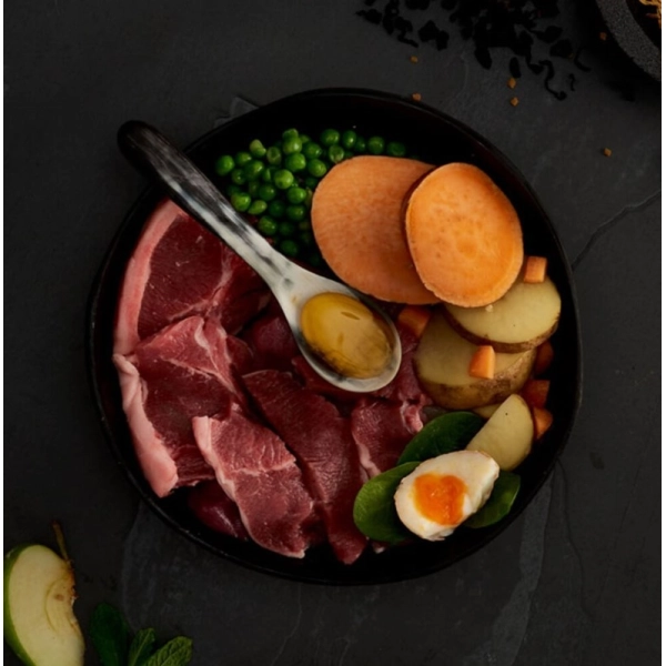 Čerstvo pripravené jahňa (42,5 %), sušené jahňacie mäso (17 %), batáty (sladké zemiaky), zemiaky, hrachový proteín, hrach, zemiakový proteín, sušené vajcia (3 %), lucerna, šťava z jahňacieho mäsa (1,5 %), lososový olej (1 %), minerálne látky, glukozamín (1000 mg/kg), MSM (1000 mg/kg), jablko, mrkva, špenát, psyllium, morské riasy, fruktooligosacharidy, chondroitín sulfát (700 mg/kg ), harmanček, mäta, nechtík, brusnice, aníz, senovka (grécke seno).